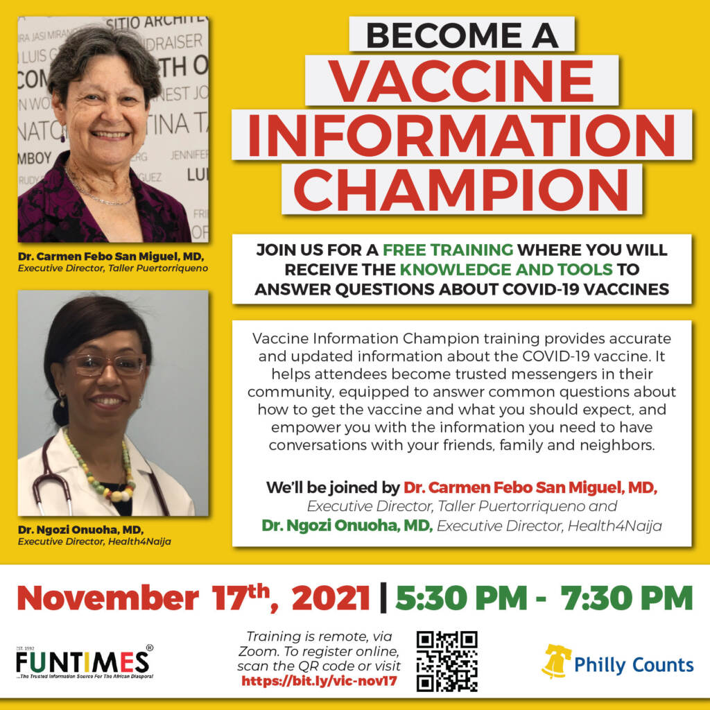 The Vaccine Champion Training Program hosted by FunTimes Magazine and Independence Media Foundation will take place Nov. 17. To register, log on here or go to FunTimesMagazine.com. If you’d like to set up your own training session log on to Phila.gov/phillycounts for more information.